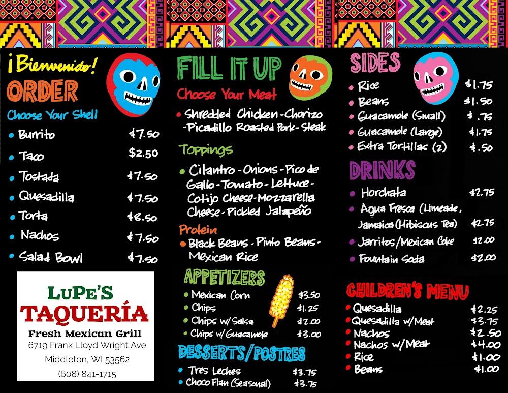 Welcome to Lupe's Taqueria, your go-to destination for authentic Mexican cuisine in Middleton, WI. Nestled at 6719 Frank Lloyd Wright Ave, we offer a vibrant and laid-back atmosphere perfect for solo dinners or groups alike. Enjoy our delicious, traditional dishes like burritos and healthy options, available for dine-in, takeout, or delivery. With quick service, wheelchair accessibility, and a family-friendly menu, everyone is welcome to savor our culinary delights. Join us for lunch or dinner, and don't forget to explore our selection of drinks, including beer. Experience the flavors of Mexico at Lupe's Taqueria!